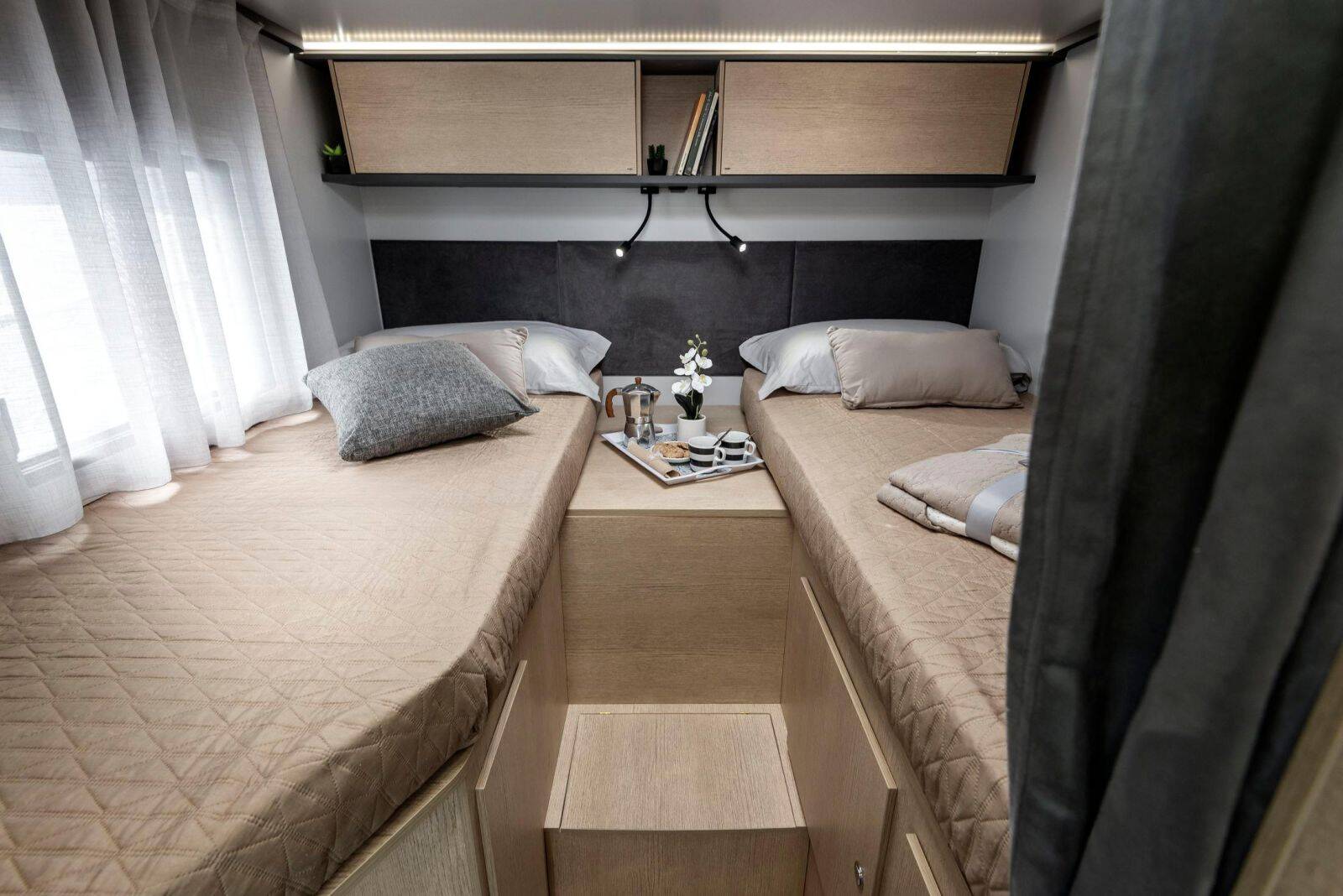 Chaque modèle allie esthétisme italien, optimisation des volumes, équipements complets et solutions techniques innovantes. Le design extérieur se veut dynamique et fluide, tandis que les intérieurs sont pensés comme de véritables espaces de vie mobiles : ambiance chaleureuse, matériaux de qualité, rangements généreux et finitions soignées témoignent du soin apporté à chaque détail.