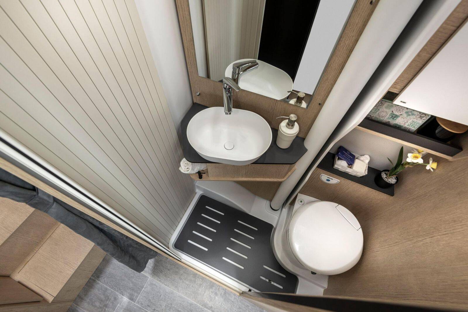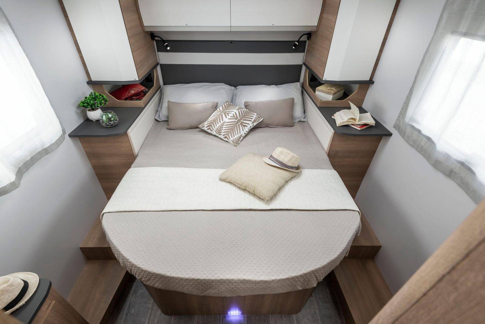 Le Siena 330, d’une longueur de seulement 5,99 mètres, offre une solution compacte sans compromis : lit transversal, salle d’eau fonctionnelle, coin repas modulable et ambiance lumineuse.